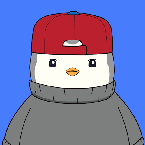A cartoon penguin, part of Pudgy Penguins, looks sad and annoyed, wearing a red cap and grey sweater.