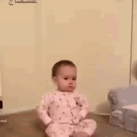 A baby in pink pajamas makes a sad, pouty face, then looks around with a serious expression.