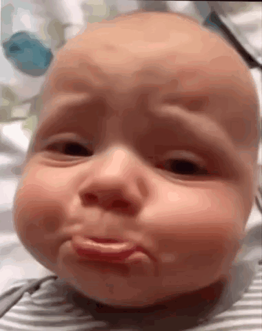 Adorable baby with a bald head making a sad, pouting face, looking directly at the camera.