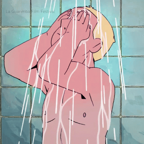 An animated man showers, covering his face in a moment of sadness, featured by La Guarimba Film Festival.