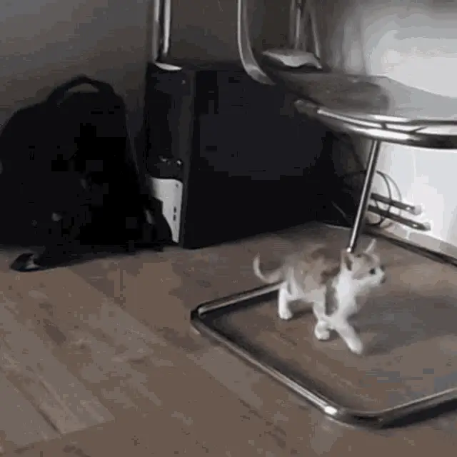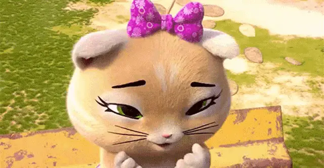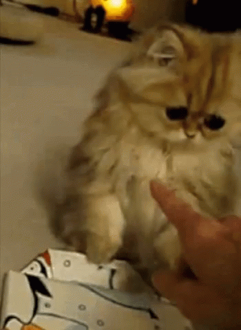 An adorable fluffy kitten with big, sad eyes is gently petted by a human finger.