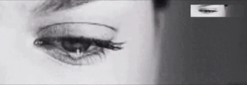 A close-up, black and white shot of a woman's eye as a single tear rolls down her cheek.