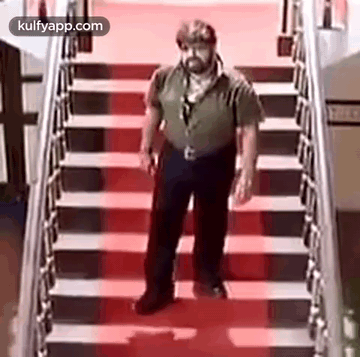 T. Rajendar walks down a red-carpeted staircase in a scene from the movie Veerasamy, looking worried.