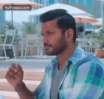 Actor Vishal shows a sad reaction, sitting outdoors in a plaid shirt, looking contemplative.