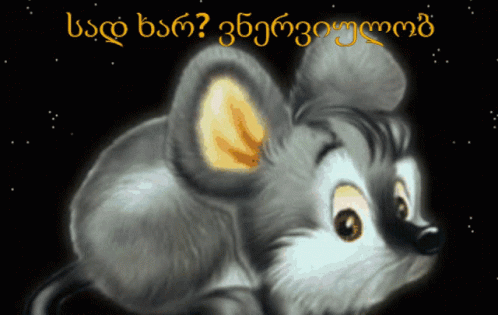 An animated grey mouse with large ears, accompanied by Georgian text asking 'Where are you? I'm nervous'.
