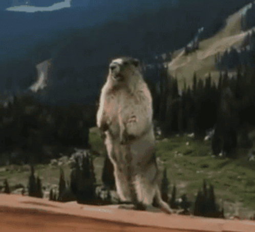 A marmot stands upright in a mountain landscape, comically yelling 'SAF!!!!' as a popular meme.
