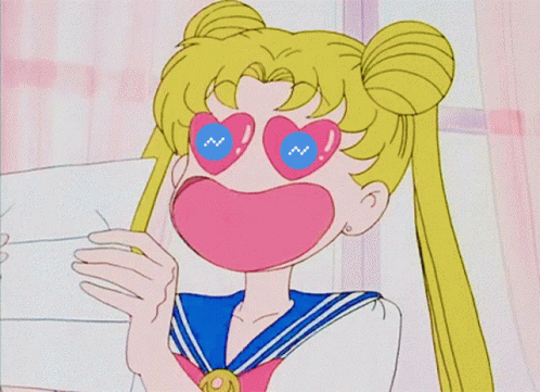 Sailor Moon with heart-shaped eyes holds a piece of paper close to her face, appearing to kiss it.
