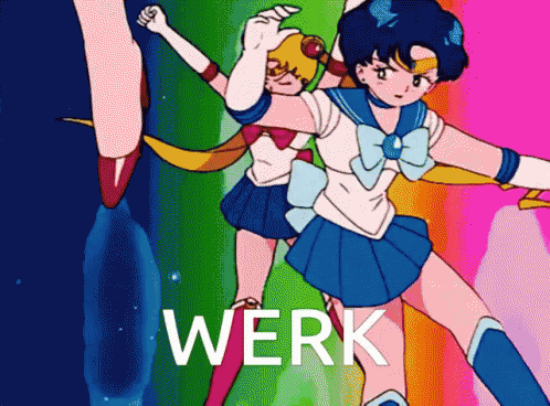 Sailor Moon, Sailor Mars, and Sailor Mercury strike powerful poses, showing off their iconic 'Werk' attitude.