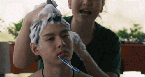 Orn Patchanan lovingly washes Saint Suppapong's hair with soap and brushes his teeth in a pampering scene.