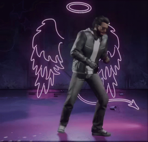 A Saints Row character performs a dance emote in front of neon angel wings and a halo, showcasing a rock star vibe.