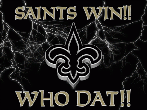 Animated graphic celebrating a New Orleans Saints victory with the iconic 'Saints Win!' and 'Who Dat!' chants.