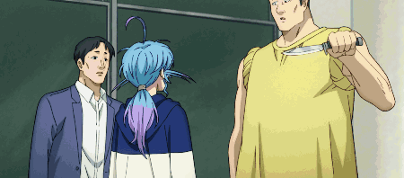 a man in a yellow shirt is holding a knife in his pocket