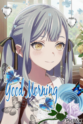 Sakiko Togawa from Bandori smiles in an anime illustration featuring 'Good Morning' text, butterflies, and flowers.