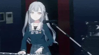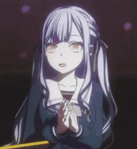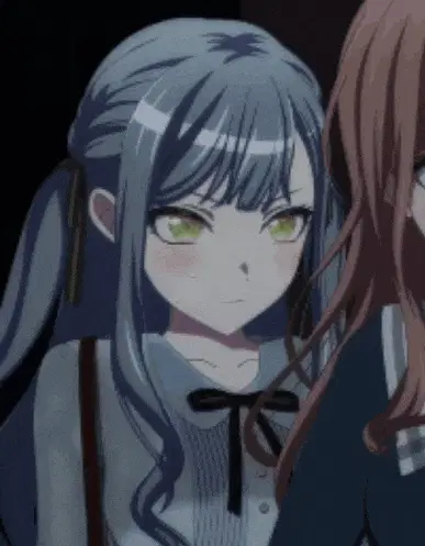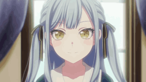 a girl with blue hair and yellow eyes is smiling