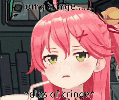 Sakura Miko reacts with extreme cringe, closing her eyes and appearing to 'die of cringe' while drinking.