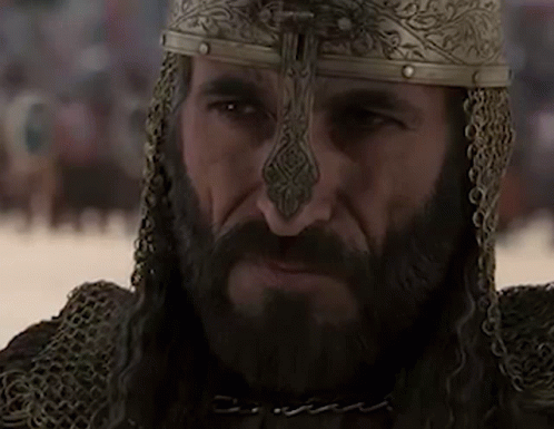 Saladin, portrayed by Karim Samir, delivers a powerful line: 'I'm not THOSE men,' wearing his chain mail and helmet.