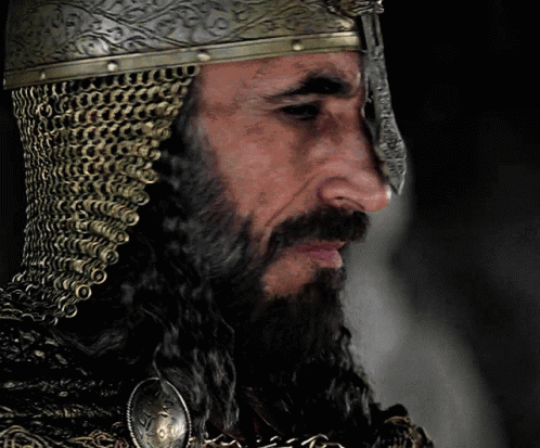 A powerful depiction of Saladin, the legendary Muslim sultan, wearing a helmet and chain mail.