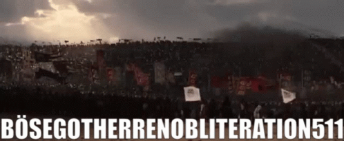 A massive crowd gathers under a dramatic sky, with the text 'EGOTHERRENOBLITERATIO' displayed, featuring Saladin and Bosego.