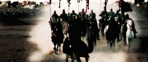 Saladin's armored army on horseback charges through a dusty landscape in an epic scene from Kingdom Of Heaven.