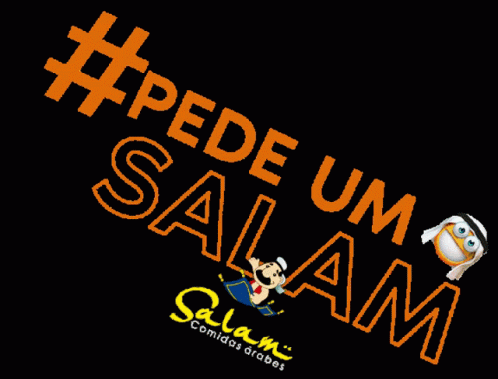 Advertisement for Salam Comidas Árabes featuring the slogan #PEDE UM SALAM with cartoon characters.