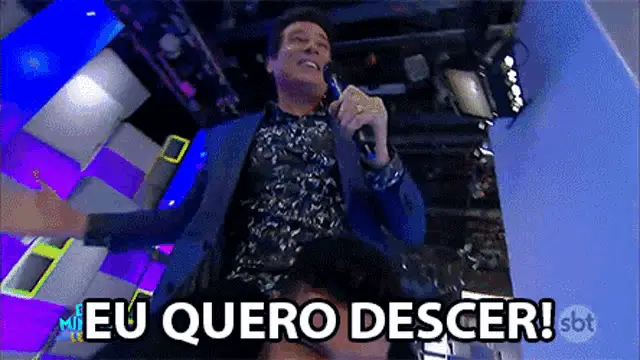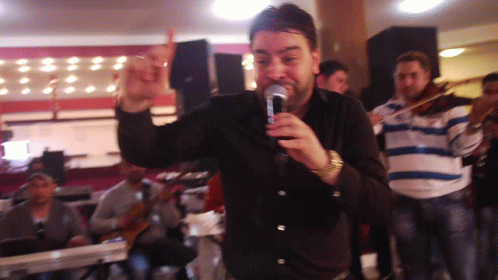 Florin Salam performs live, singing manele music into a microphone and pointing to the crowd.