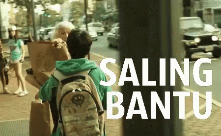 A person with a backpack walks on a street, with the text 'Saling Bantu' (Help Each Other) displayed.