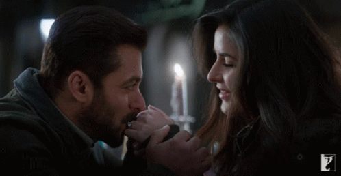 Salman Khan kisses Katrina Kaif's hand in a romantic moment, illuminated by candlelight.