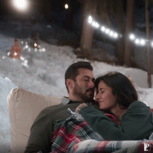 Salman Khan and Katrina Kaif are seen resting peacefully together on a couch in a snowy, festive outdoor setting.