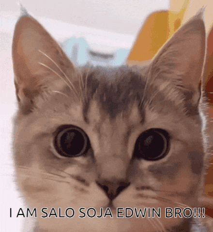 A close-up of a cute cat with wide eyes, featuring the caption 'I AM SALO SOJA EDWIN BRO!!!'.