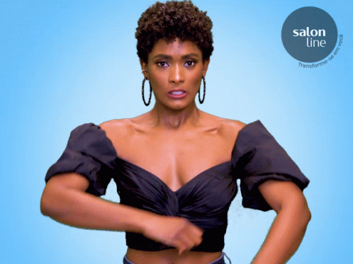 Erika Januza, with curly hair, looks upset in a Salon Line ad against a blue background.