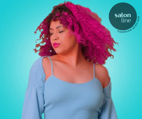 A woman with vibrant pink curly hair dances, showcasing Salonline products against a bright blue background.