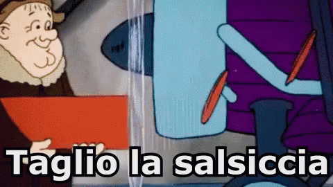 An animated man cuts a sausage with a blade, featuring the Italian caption 'Taglio la salsiccia'.