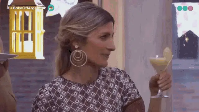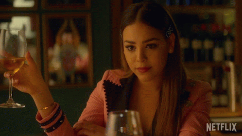 Lucrecia Montesinos Hendrich (Danna Paola) raises a glass of wine, toasting with 'Salud Por Eso' in a stylish setting.
