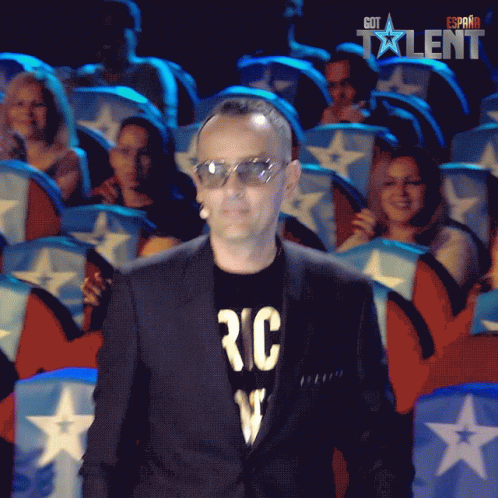 Risto Mejide, judge on Got Talent España, salutes the audience with a smile, wearing sunglasses and a suit.