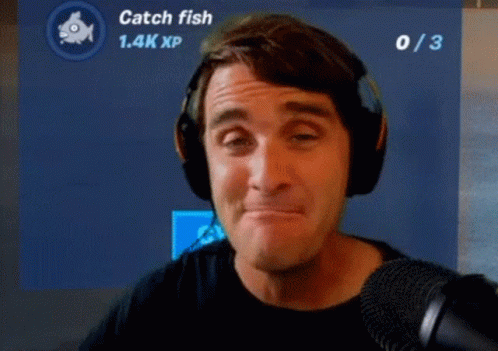 Mark Chernesky, wearing headphones, reacts energetically while playing a game with a 'Catch fish' quest.