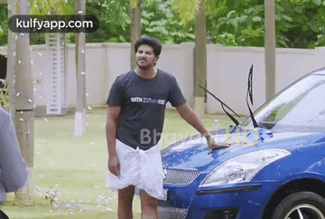 Actor Dulquer Salmaan salutes while standing next to a blue car, possibly during a car wash scene.