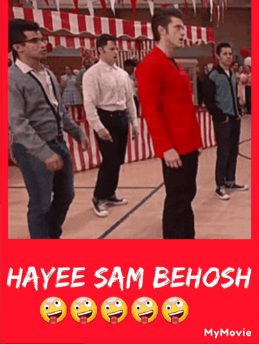 Sam dramatically faints in a red and white decorated hall, supported by a friend, as others watch.