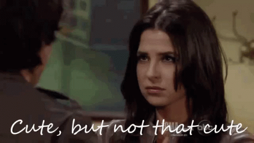 Sam McCall and Dante Falconeri from General Hospital share a moment with the caption 'Cute, but not that cute' on screen.