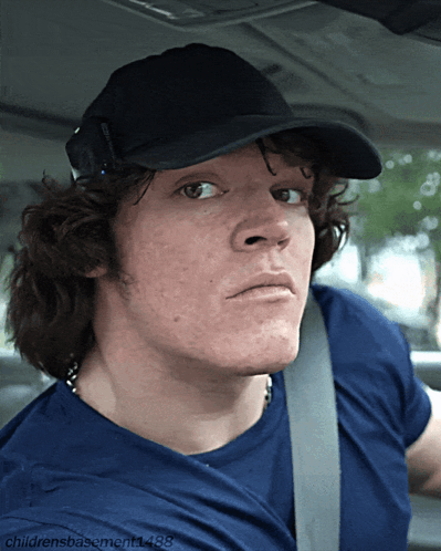 Sam Sulek demonstrates the mewing technique, pushing his jaw forward while wearing a black cap and blue shirt.