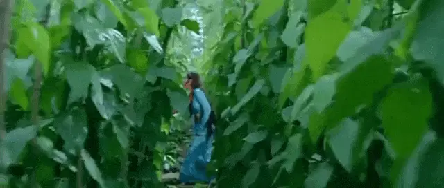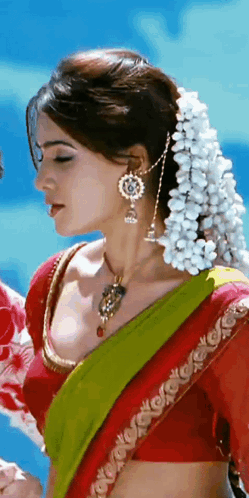 Samantha Ruth Prabhu in a vibrant red and green saree with white flowers in her hair.