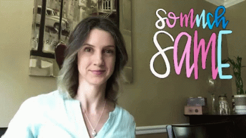 Nutritiondoula smiles and gestures in front of a 'so much SAME' graphic, expressing a relatable sentiment.