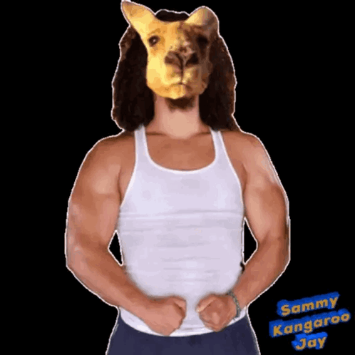 Sammy Jay, a man with a kangaroo mask, flexing his biceps in a white tank top against a black background.