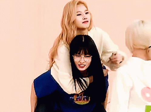 TWICE's Sana gives Momo a playful piggyback ride, with Momo wearing glasses and smiling brightly.