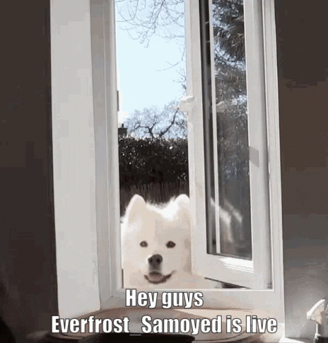 Everfrost Samoyed, the fluffy white dog, announces a live stream from the window.