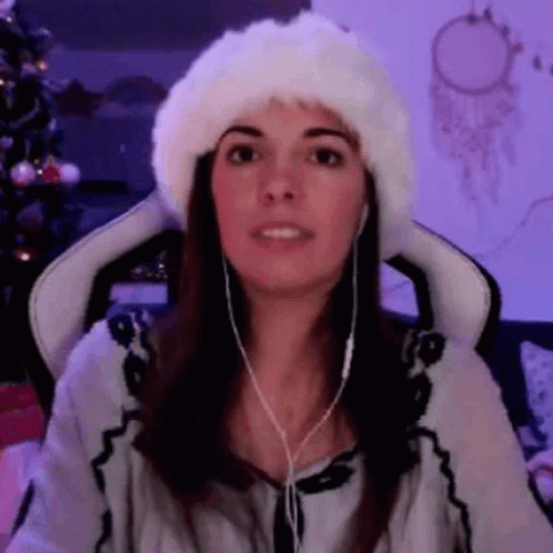A woman wearing a white fluffy Santa hat and earphones makes a cute, amused face while sitting in a chair.