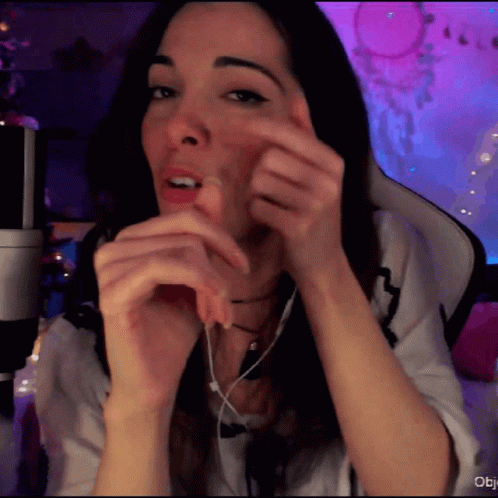 Samuse Monœil, a woman wearing headphones and a white shirt, sits in front of a microphone with a purple background.