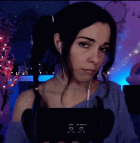 A woman with pigtails and earbuds makes a series of sad and pouting faces, then smiles briefly.