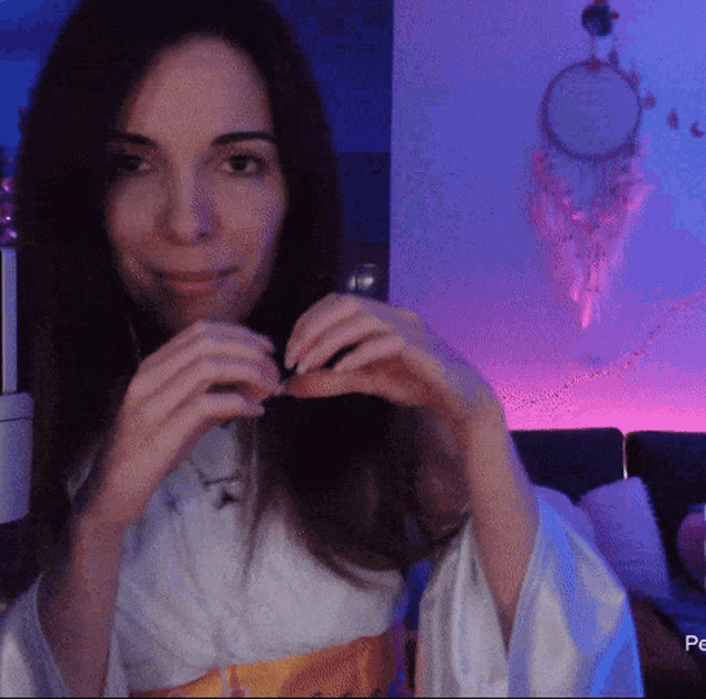 Samuse Yuna, possibly cosplaying Final Fantasy's Yuna, makes a heart gesture and speaks French phrases.