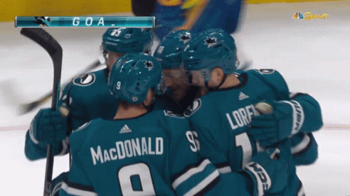 San Jose Sharks players Evgeny Svechnikov, MacDonald, and Loren celebrate a thrilling goal on the ice.