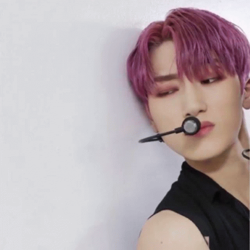 ATEEZ member San with purple hair, wearing a microphone, then playfully looking over another member's shoulder.